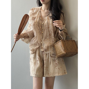 新しい中国風の女性用スーツ夏の新しいレトロな長袖カジュアルファッションハイウエストワイドレッグショーツ女性用2点セット