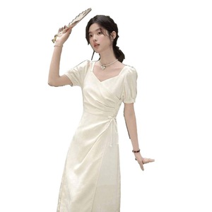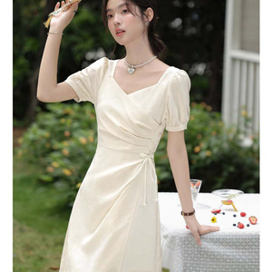 フレンチ「フラワーワイン」アプリコットフレンチスクエアネックドレス女性用2025夏気質ウエストピンチロングスカート