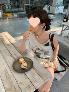 le rouge周美美 猫猫的突围不对称斜肩假两件叠穿印花短袖T恤