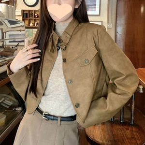 美拉德咖色复古皮衣春秋小个子美式夹克上衣外套百褶短裙两件套女