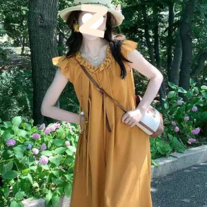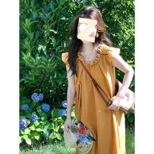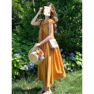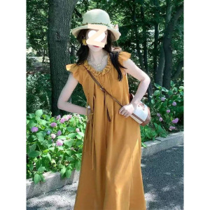 女性のための黄色のフライングスリーブドレス 2025 夏の新しいスタイルフレンチビーチ休暇ルーズ痩身ミディスカート