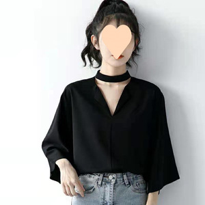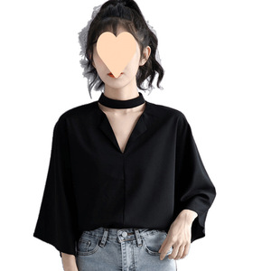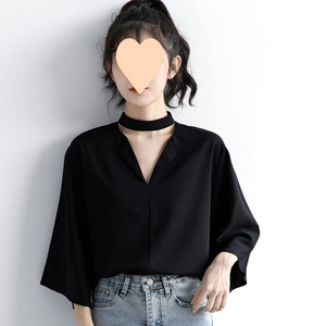 2025 春夏の新黒七分袖シャツ女性のファッショナブルなスタイルの繊細なデザイン襟ホルタートップ