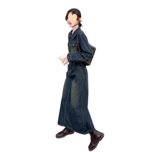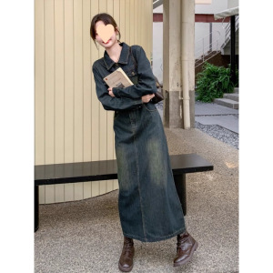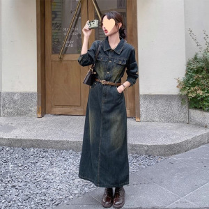 2025新款时尚休闲复古色中长款牛仔连衣裙女春秋款收腰显瘦长裙子