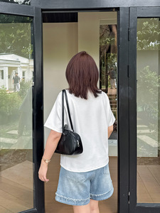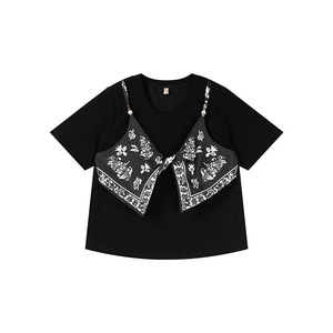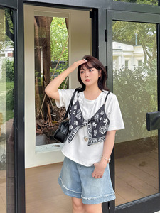 Shuangtian 2025 夏新ファットシスター大きいサイズ婦人服 100kg プリントステッチ偽ツーピース Tシャツ 9001