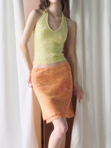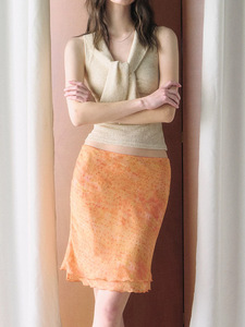 Hinichi オレンジプリントローウエスト A ラインミドル丈ストレートスカート女性のスリムで微透明なスカート夏のデザイン