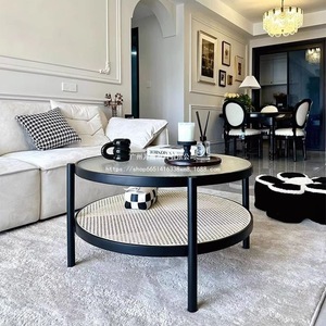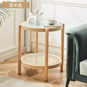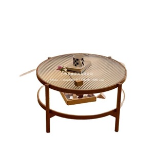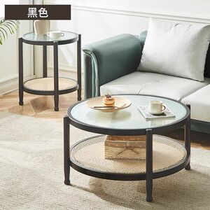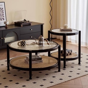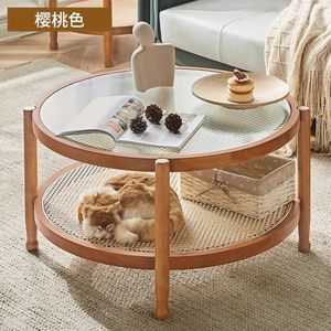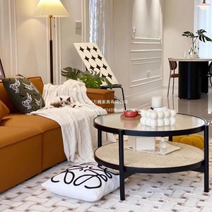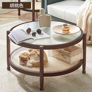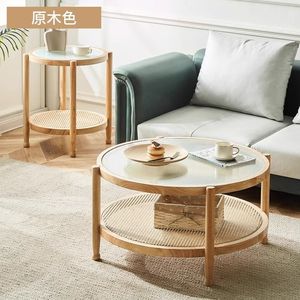 万腾日式茶几桌客厅家用实木藤编ins长虹玻璃双层圆形简约现万腾