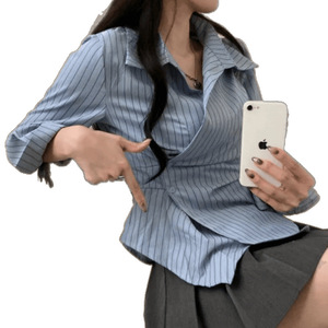 韓国風デザイン不規則ウエスト秋シャツストライプカレッジスタイルシャツ長袖新作スリムトップ