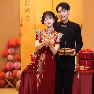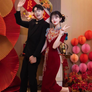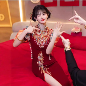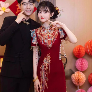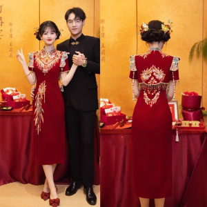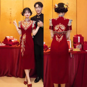 重工業婚約チャイナドレス乾杯ドレス 2025 新しいブライダルウェディングドレス小柄なベルベット Xiuhe ドレス結婚式のドレス夏