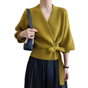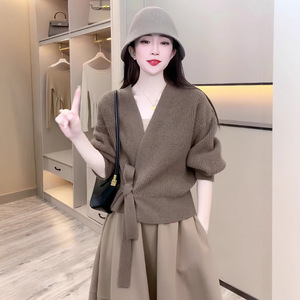 フレンチハイエンドニットカーディガンレディース秋2025ストラップ付きVネックエレガントショート長袖トップ