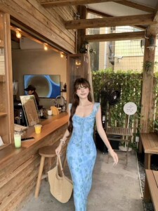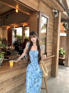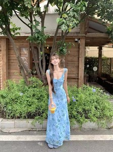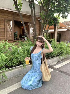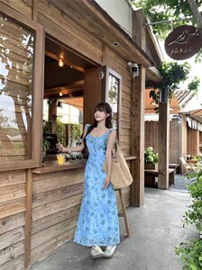 ブルーローズ気質ドレス女性の夏の2025新しい甘いスタイルフラワープリントスリムAラインロングスカート
