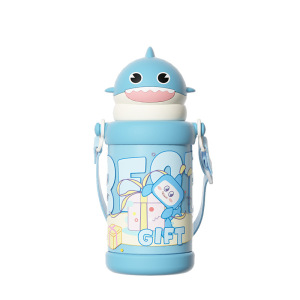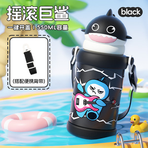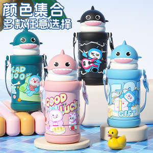新款卡通鲨鱼吸管水杯男女高颜值316不锈钢保温杯便携调节背带杯