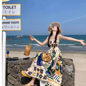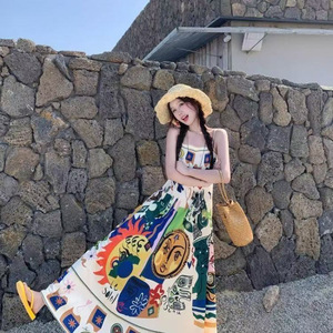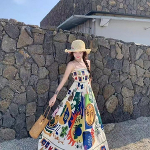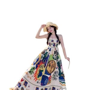 エスニックスタイル落書きプリントサスペンダードレス女性のための夏の 2025 新しいウエスト痩身大きな裾 A ラインロングスカート
