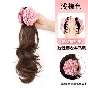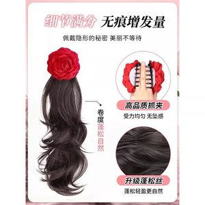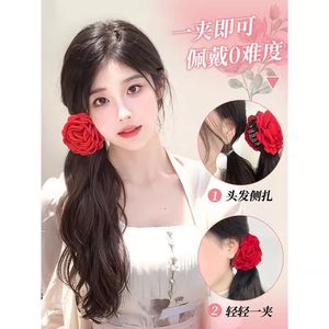 ウィッグポニーテールレッドローズフラワーヘアピン女性のサイドクリップ少しカーリーウィッグポニーテール人工毛グリッパーポニーテール