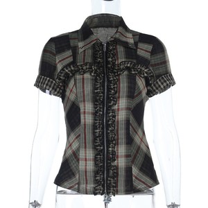 XS2514 ダークチェック柄シャツ女性のための 2025 新しいホットガールスタイルジッパーデザインハイストリート戦闘ダメージ加工トップ
