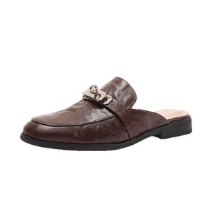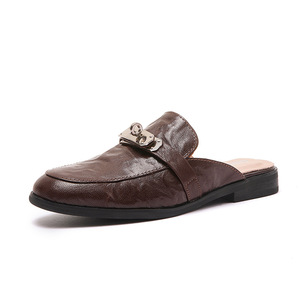 スリッパ包頭スリッパ女性のアウターウェア春と夏の新しいスタイルのフルレザーハーフスリッパシープスキンクッション英国スタイルサンダル
