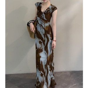 2025 新しい夏のエレガントなスタイルのブルーミング巾着 V ネックストラップ痩身ドレスフェミニンなスカートトレンディ