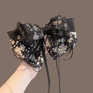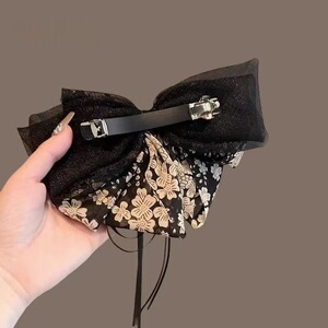 女性用の黒のレトロな大きなリボンヘアピン、エレガントでファッショナブルなヘアピン、スプリングクリップ、後頭部トップクリップ
