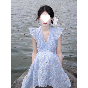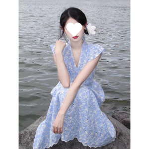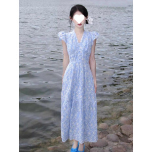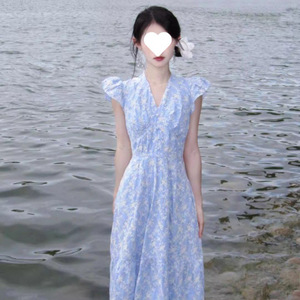 スーパーフェアリー優しいスタイルファッショナブルなハイエンドブルーVネックドレス女性の夏の韓国スタイルスリム気質ミドル丈スカート