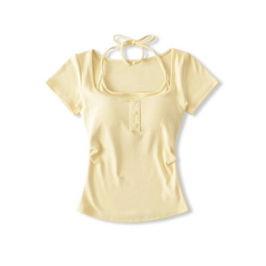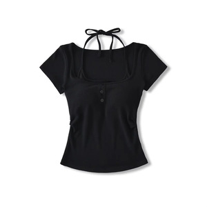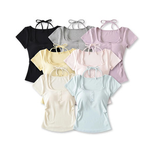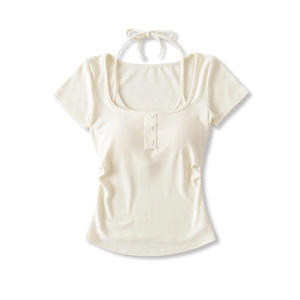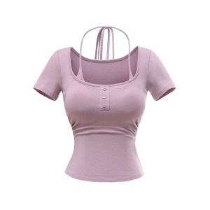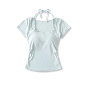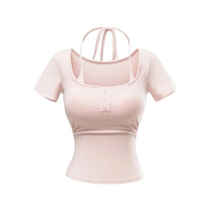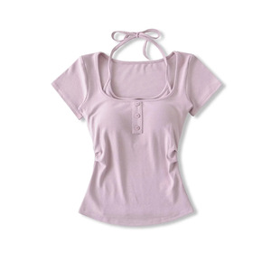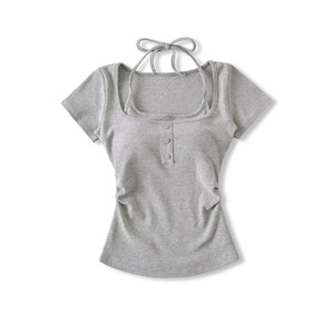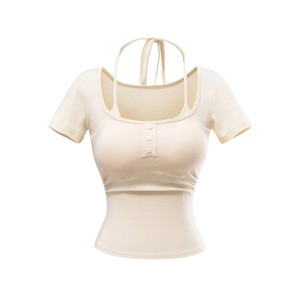ヨーロッパとアメリカのコミック胸パッド偽ツーピースホルターネックレースアップ半袖Tシャツ女性の純粋な欲望ホットガールスリムプリーツショートトップ