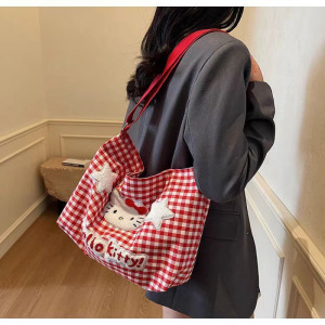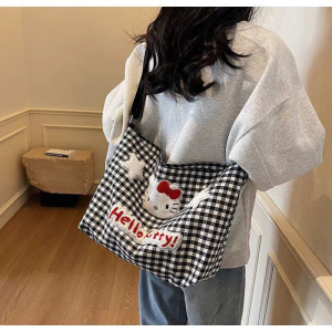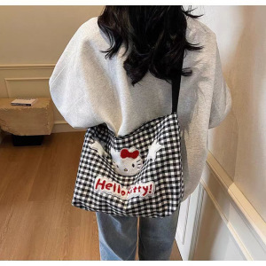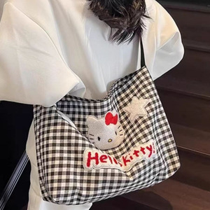 かわいいハローキティチェック柄ショルダーバッグ女性漫画大容量クロスボディキャンバスバッグ学生クラスの通勤バッグ