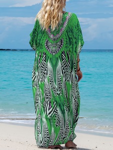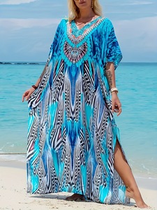 女式夏季波西米亚风侧开叉沙滩罩衫优雅宽松v领数码印花跨境外贸
