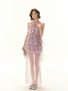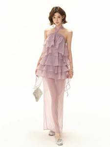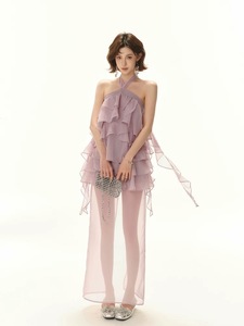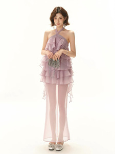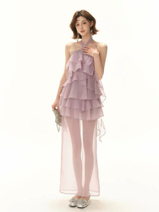 レイジーリゾートスタイル2025社交界の淑女初夏のエレガントなパープルケーキレースアップホルターネックドレススリット付き