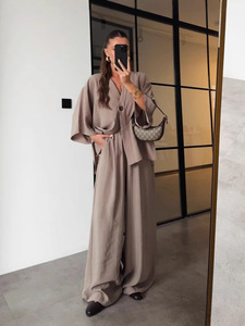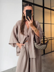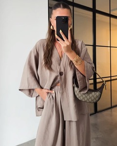 2025 クロスボーダーレディースファッションカジュアルスーツ V ネックワンボタンルーズ長袖トップハイウエストパンツ 2 点セット