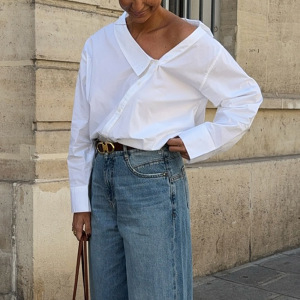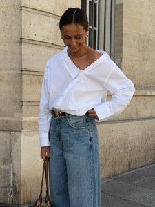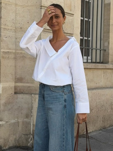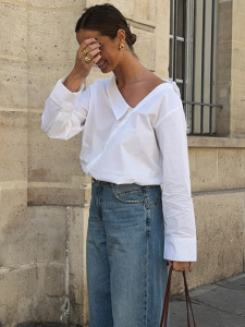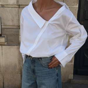 秋の新作ルーズホワイト不規則長袖シャツデザイン、ファッショナブルでカジュアル、2025年国境を越えた通勤