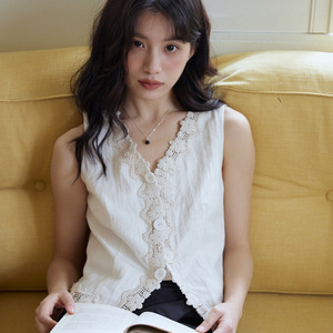 MIXABO フレンチアプリコットレース V ネックベストレディースサマーデザインベストノースリーブプリーツテクスチャートップ