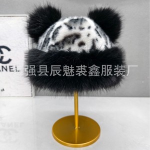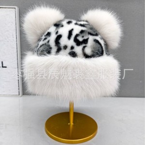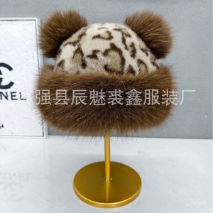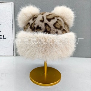 2025新款豹纹蒙古帽子毛绒小熊耳朵帽子女秋冬季仿皮草渔夫帽百搭
