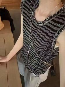 夏の新しいファッションデザインの小さな香りのラウンドネックストライプローエッジセーターベスト女性の多用途カジュアルトップ