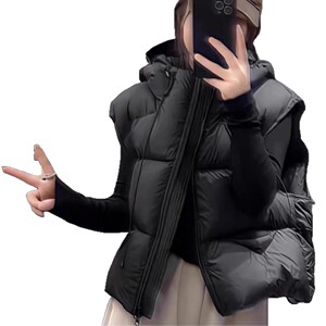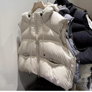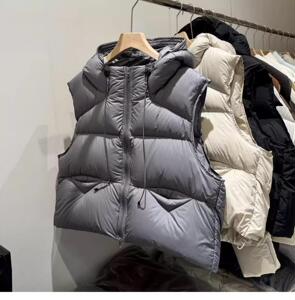 2025 ホワイトダックダウンベスト女性の小柄な秋冬フード付きルーズショートパフベスト暖かいジャケット