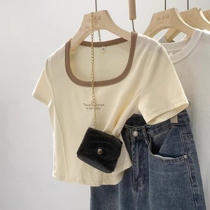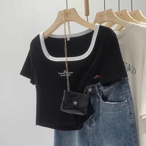 女性のための右肩薄い半袖 T シャツ夏 2025 カラーブロック純粋な欲望ホットガール痩身鎖骨コントラストカラーショートトップ