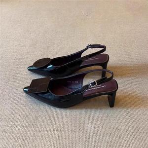 全羊皮~2025新款包头粗跟单鞋女尖头后空中跟粗跟凉鞋