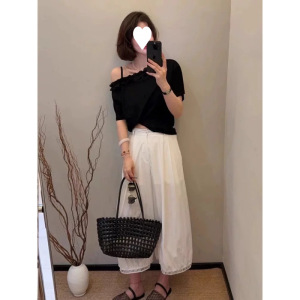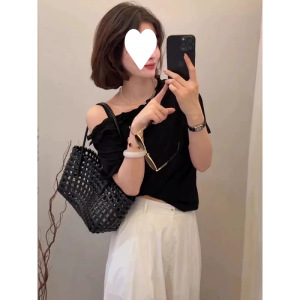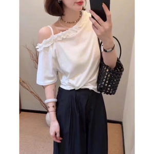 花边吊带露肩短袖t恤女设计感小众夏季独特漂亮小衫斜肩白色上衣