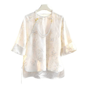 夏の女性のための白い新しい中国風の刺繍シャツ、超見栄えの良い、シックなレトロなラウンドネックボタン付きの軽い中国風のトップ