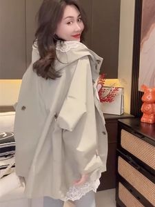 2025胖mm大码韩版蕾丝拼接设计冲锋衣百搭显瘦遮肉通勤风风衣