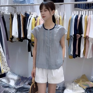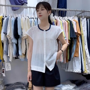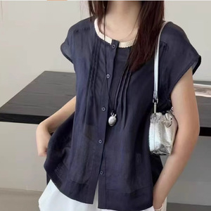 韓国ニッチラウンドネックコントラストプリーツ半袖シャツ女性のための 2025 夏の新しいファッションデザインレトロトップ