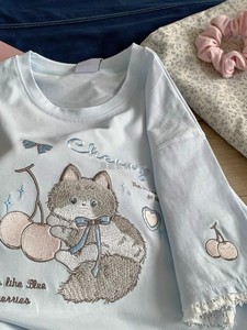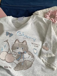 年齢を軽減するかわいい桜猫刺繍半袖Tシャツ女性用2025夏新作ルーズラウンドネックレース万能トップ