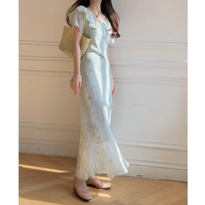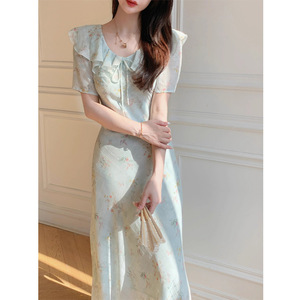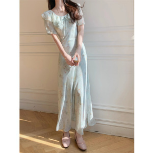 2025 新しい夏スタイルのバイアスカットフリル襟フレンチウエスト痩身ミントグリーンプリント花柄ドレスミドル丈