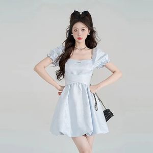 ジャカードブルーフレンチスクエアネックドレス女性の夏の新しいスタイルのパフスリーブ甘いプリンセスフラワースカート