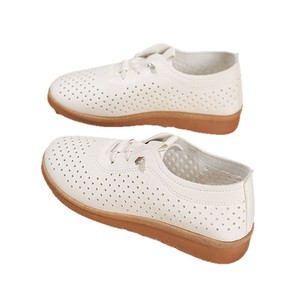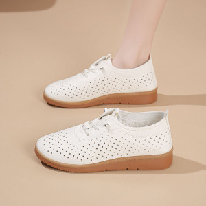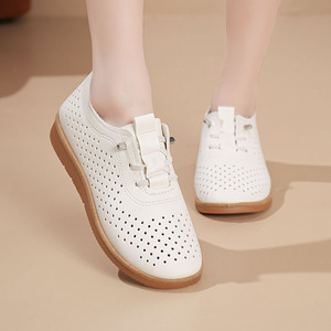 夏用の柔らかい表面の柔らかい革の腱の柔らかい底の小さな革靴、女性用の中空通気性メッシュシューズ、中年母親用の平底滑り止めサンダル