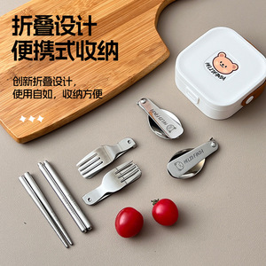 熊家族304不锈钢户外可拆卸叉勺筷套装折叠餐具便携多功能收纳盒