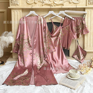 2025年新作 クロスボーダー アイスシルクプリント ホームウェア レディース 夏 セクシー ランジェリー ネグリジェ セクシーパジャマセット 秋