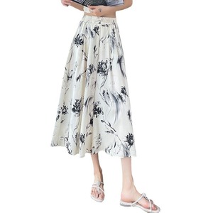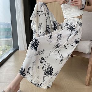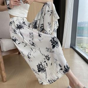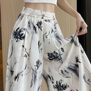 2025 新国民風カジュアルワイドレッグパンツ女性の夏薄いハイウエストルーズカジュアル水墨画プリントスカート