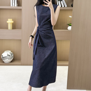 フレンチファッショナブルなツイストストラップデザインデニムベストドレス2025夏スリムロングスカート