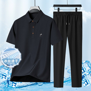 夏季冰丝休闲男套装中年爸爸短袖T恤裤子两件套中老年人爷爷衣服