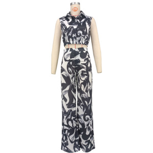 8723 アマゾンクロスボーダーカジュアル夏と秋ラペルノースリーブウエストトップとカジュアルパンツレディースツーピースセット