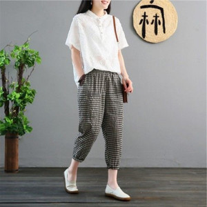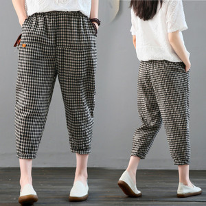 H2V 【7939回購入】アーティスティックコットンとリネンチェック柄9点ハーレムパンツ レディース 夏 デブMM カジュアル 小脚パンツ ワイド