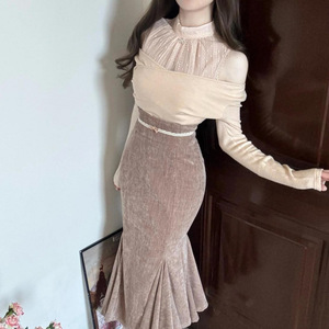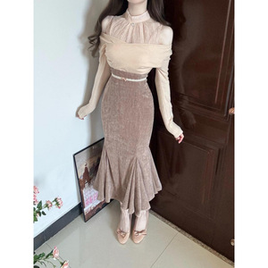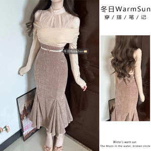纯欲风假两件挂脖恤套装女秋冬高腰包臀鱼尾半身裙甜美露肩上衣